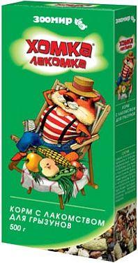 В традиционный состав корма "ХОМКА" (семена злаковых, бобовых растений и подсолнечника, травяные гранулы, орехи, сухие овощи и фрукты) включены лакомства: хрустящие трубочки и воздушная кукуруза.