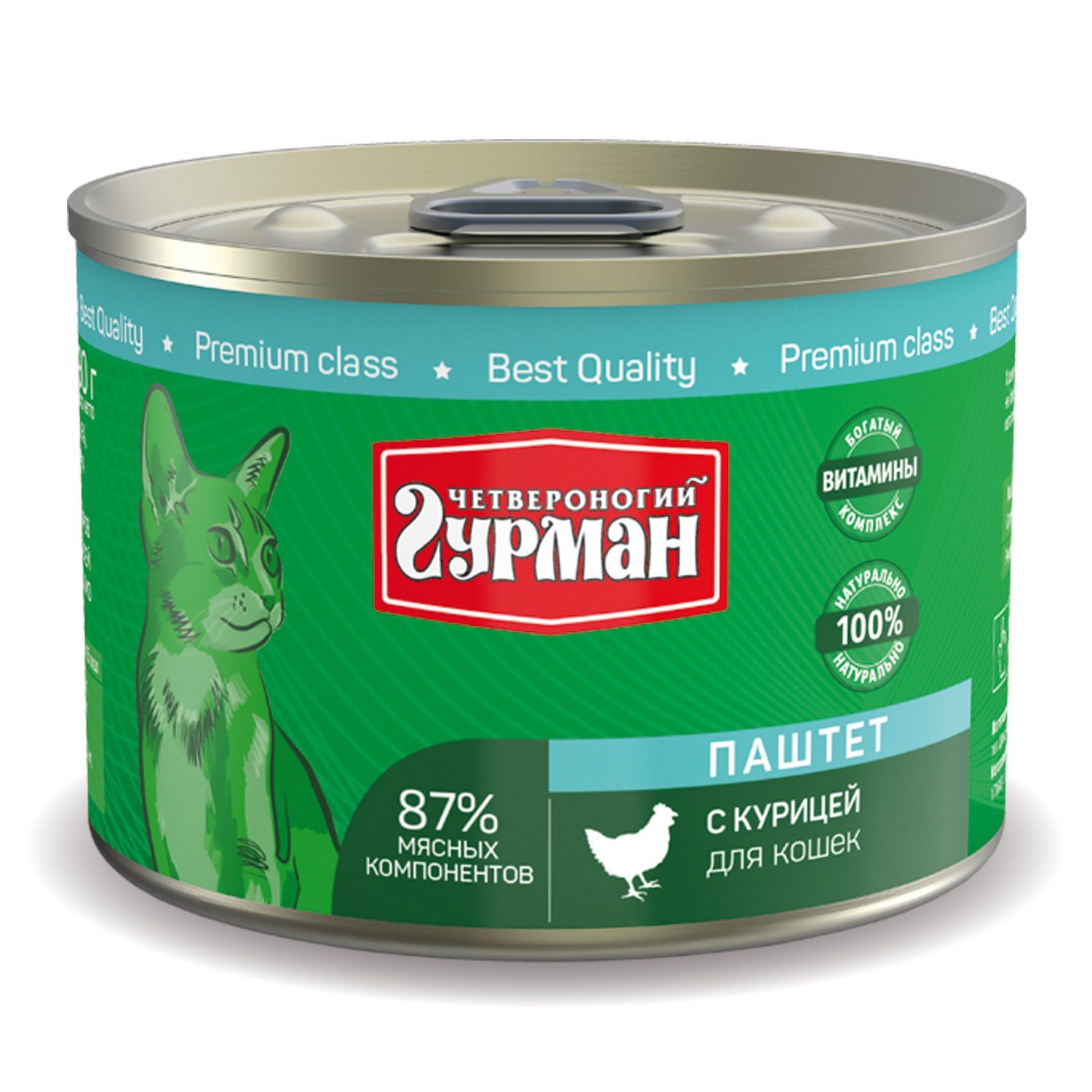 Состав: курица (не менее 40%), мясные субпродукты, крупа рисовая (не более 3%), плазма крови, желирующая добавка, клетчатка, масло подсолнечное, рыбий жир, дрожжи, таурин. Питательная ценность в 100 г продукта: протеин — 7 г, жир — 4,5 г, клетчатка — 0,5 г, зола — 2 г, таурин — 0,2 г, влага — 82 г. Минеральные вещества (в 100 г продукта): P — 108 мг, Ca — 9 мг, Na — 152 мг, Cl— 187 мг, K — 215 мг, Mg — 12 мг, Fe — 3 мг, Cu — 265 мкг, Co — 1,1 мкг, Mn — 88 мкг, I — 2,4 мкг. Витамины: А — 970 МЕ, Е — 0,16 МЕ, В1 — 0,04 мг, В2 — 0,23 мг, В3 — 1,06 мг, В5 — 0,6 мг, В6 — 0,08 мг. Энергетическая ценность: 85 ккал.