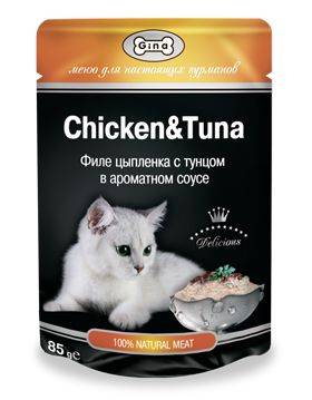 Консервированные корма для кошек Gina — это изысканные деликатесы супер премиум класса для вашего любимца. Корм производится на современном заводе «Thai Union Manufacturing Co. Ltd.» в Таиланде. Благодаря содержанию только свежих, качественных компонентов корм обладает естественным запахом и отличной вкусовой привлекательностью. Влажные корма Gina изготовлены на основе мяса тунца, признанного настоящим рекордсменом среди других видов рыб по содержанию белка — недаром его называют «морской телятиной». Большое количество макро- и микроэлементов, витаминов, аминокислот, повышенное содержание комплекса Омега-3 делают тунец особо ценным продуктом. Мы создали целую линейку паучей Gina, дополнив мясо тунца овощами, говядиной, цыпленком и сардинами. Поэтому вы можете варьировать меню вашей кошки, включая в него разные виды лакомств, или остановиться на ее любимом вкусе. Хранить в сухом и прохладном месте.