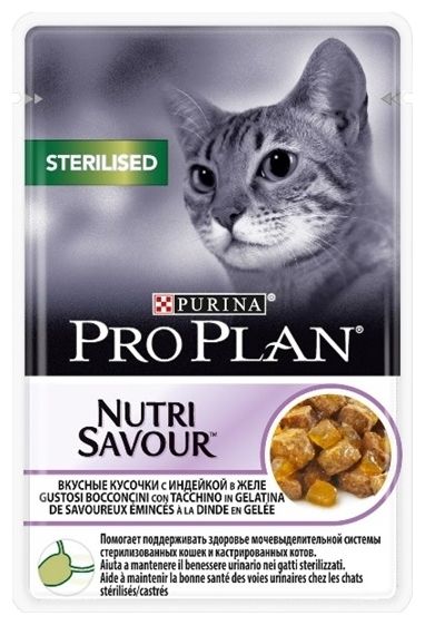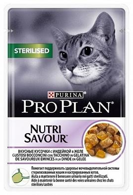 Корм консервированный полнорационный для взрослых стерилизованных кошек и кастрированных котов, вкусные кусочки с индейкой в желе
