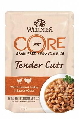 CORE TENDER CUTS паучи из курицы с индейкой в виде нарезки в соусе для кошек. Беззерновые паучи Wellness CORE Tender Cuts cозданы с учётом естественных потребностей домашних питомцев. Гарантированное содержание высококачественного натурального белка животного происхождения в рационах. С помощью правильных углеводов, овощей, фруктов и пребиотиков Wellness CORE обеспечивает сбалансированное натуральное беззерновое питание для кошек. Преимущества влажных рационов Wellness CORE: Оптимальный баланс белков, жиров и углеводов. До 58% свежих мясных ингредиентов. Сочетание нескольких источников белка. Большое количество витаминов, минералов и антиоксидантов для поддержания иммунитета. Легкоусвояемая формула с клетчаткой для здоровой микрофлоры. Беззерновое питание. Не содержит пшеницу, кукурузу и сою. Подходит для животных с чувствительным пищеварением. Жирные кислоты Омега-З и Омега-6 в оптимальном соотношении для здоровья кожи и шерсти. Условия хранения: Хранить при температуре от 0 до +25°С, относительной влажности воздуха не более 80%. Срок годности: 24 месяцев.