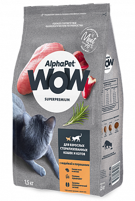 Мясные ингредиенты 44,5%, в том числе свежее мясо 10% (индейка, свиные субпродукты) Дегидрированное мясо домашней птицы 32% Пшеница Рис 15% Сушеная мякоть сахарной свеклы Животный жир Гидролизованная куриная печень Желтый горошек Витаминно-минеральная смесь Пивные дрожжи Рыбий жир Комплекс AlphaPetBIO® (зеленогубый моллюск, календула, одуванчик, льняное семя, цикорий, клюква, Юкка Шидигера, розмарин) Таурин DL-метионин Антиоксидант