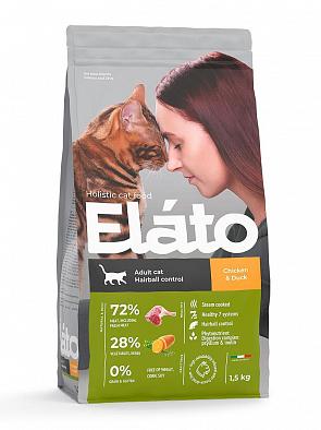 Полнорационный беззерновой корм для взрослых кошек с высоким содержанием мяса курицы и утки для выведения комочков шерсти из желудка и кишечника. Здоровье наших любимцев во многом зависит от питания. Очень важно правильно выбрать корм, который будет соответствовать потребностям питомцев, наполнит их силой и энергией для активной жизни. Ответственный выбор корма — лучшее выражение настоящих чувств! Корм ELATO по-настоящему наполняет Ваших любимцев жизненной силой, энергией и укрепляет их здоровье. Ключевые особенности: Содержит до 73% мяса, включая свежее мясо. Хорошо поедается животными благодаря высокому содержанию мяса и особому напылению гидролизата печени на гранулы корма. Выведение комочков шерсти из желудка и кишечника. Сбалансирован по содержанию мяса, овощей и трав. Не содержит зерна, искусственных ароматизаторов и консервантов. Изготовлен с обработкой паром. Поддерживает здоровое состояние 7-и важных систем и органов. Укрепляет иммунитет за счет женьшеня, конопли посевной, псиллиума.