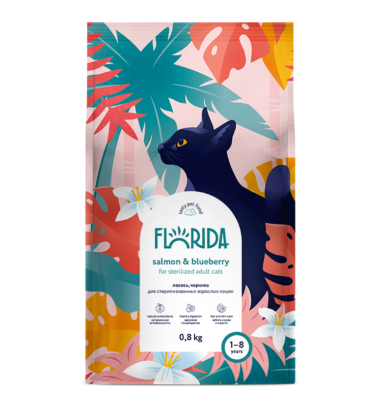 Florida Salmon & Blueberry - сухой корм супер-премиум класса с лососем и черникой для стерилизованных кошек в возрасте от 1 до 8 лет. Сбалансированное полнорационное питание заботится о коже и шерсти и способствует здоровому пищеварению.