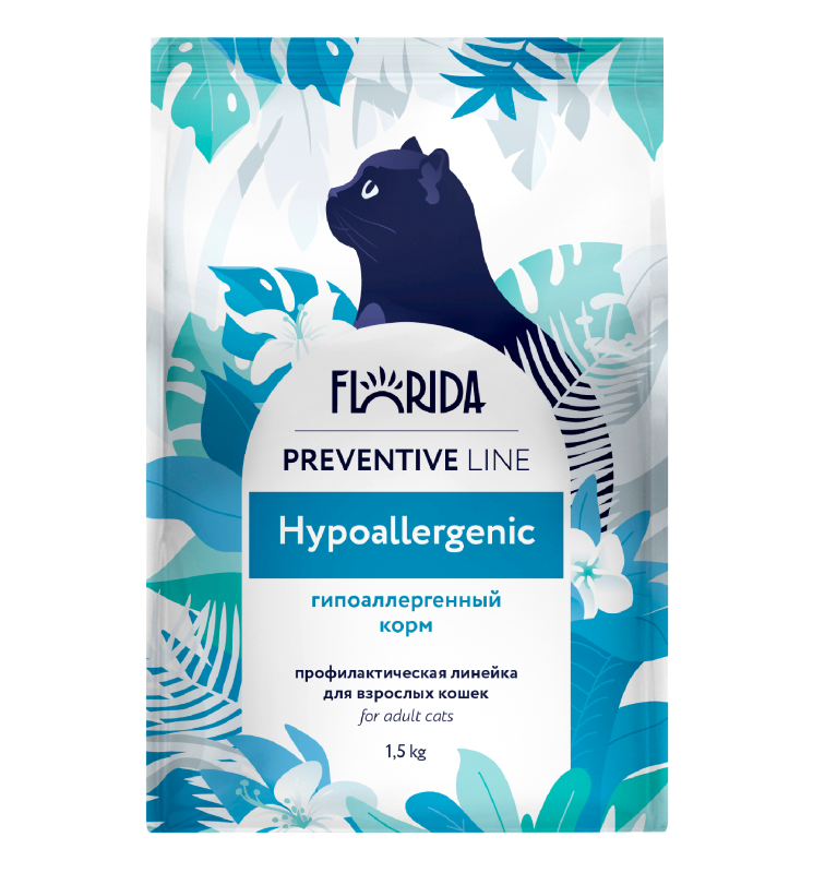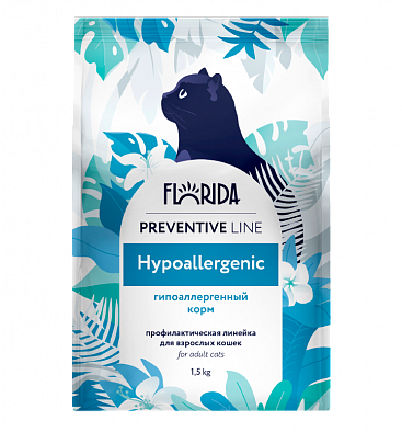 Полнорационный сбалансированный сухой корм для кошек Florida Preventive Line Hypoallergenic — профилактическая диета для питомцев с повышенной чувствительностью к компонентам корма.