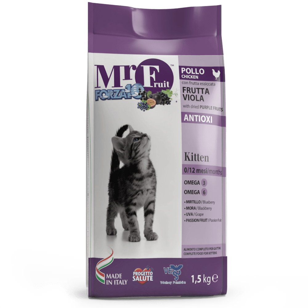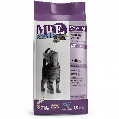 FORZA10 Mr. Fruit Kitten с фиолетовыми фруктами - очень вкусный корм для котят с высоким содержанием курицы. Чтобы способствовать правильному росту, котятам необходимо обеспечить правильными питательными веществами, а также витаминами, минералами и незаменимыми жирными кислотами. Mr. Fruit Kitten формула была разработана ветеринарами SANYPet для удовлетворения потребностей развития котят; он содержит большое количество молозива для укрепления иммунной системы. Хорошие качества фиолетовых фруктов усиливают его действие. Консерванты полностью натуральные. Соки из натуральных компонентов, предназначенные для всех этапов жизни, и цвета фруктов для здоровья и благополучия! Основные свойства фиолетовых фруктов Черника: благоприятно воздействует на зрение, обладает сильными антиоксидантными свойствами, а также оказывает защитное действие на кишечник; Ежевика: содержит большое количество витаминов А и С, а также других ценных питательных веществ. Виноградная лоза (Vitis vinifera): стандартизированный экстракт виноградных листьев и плодов содержит полифенолы и антоцианозиды. Лоза обладает защитными свойствами, связанными с микроциркуляцией, благодаря антоцианозидам, которые снижают проницаемость кровеносных сосудов и увеличивают их прочность. Проантоцианиды - это антиоксиданты и детоксифицирующие агенты, которые особенно полезны для предотвращения всех дегенеративных заболеваний и процессов старения. Маракуйя: улучшает пищеварение и расслабляет, а также содержит витамины A, B, C и E, сахар и минералы. Розмарин (Rosmarinus officinalis): естественный консервант, а также защищает сердечно-сосудистую систему.