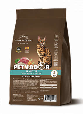 Рацион PETVADOR SENSITIVE разработан специально для домашних питомцев с чувствительной пищеварительной системой. Благодаря тщательно отобранным гипоаллергенным ингредиентам и наличию пребиотиков, данный корм гарантирует полноценный и правильный процесс пищеварения и усвоения питательных веществ. Клюква оказывает самое благотворное действие на пищеварительную и иммунную систему кошек, поддерживает здоровье мочеполовой системы и почек. Клюква богата антиоксидантами, противораковыми агентами, витамином С и клетчаткой. Льняное масло содержит в себе линоленовую и линолевую кислоты, которые относятся к незаменимым жирным кислотам. Эти кислоты являются источником для Омега-3 и Омега-6 жирных кислот соответственно. Кроме того, в состав льняного масла входят витамины А, Е, В, К. 1-ый и основной ингредиент – ДЕГИДРИРОВАННОЕ МЯСО ИНДЕЙКИ Гипоаллергенные ингредиенты Произведено в России по испанским технологиям Сбалансированное содержание Omega-6 и Omega-3 жирных кислот. Не содержит: пшеницу, свеклу, яйца, сою, ГМО, красители, искусственные ароматизаторы, искусственные консерванты.