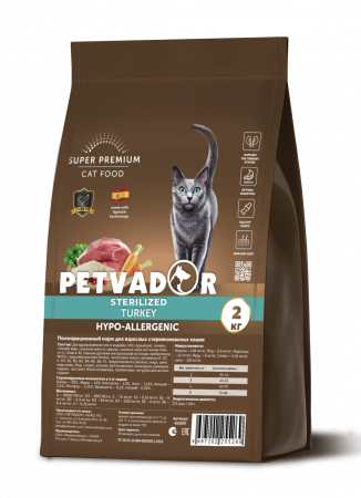 Рацион PETVADOR STERILIZED содержит в основе состава индейку – одно из самых полезных, диетических видов мяса. Индейка ускоряет обменные процессы в организме и насыщает ткани важными микроэлементами, положительно воздействующих на работу центральной нервной системы. Специальный фитокомплекс и пребиотики, способствуют гармоничному развитию, укреплению иммунитета, поддержанию микрофлоры кишечника в здоровом состоянии. Клюква оказывает самое благотворное действие на пищеварительную и иммунную систему кошек, поддерживает здоровье мочеполовой системы и почек. Клюква богата антиоксидантами, противораковыми агентами, витамином С и клетчаткой. Льняное масло содержит в себе линоленовую и линолевую кислоты, которые относятся к незаменимым жирным кислотам. Эти кислоты являются источником для Омега-3 и Омега-6 жирных кислот соответственно. Кроме того, в состав льняного масла входят витамины А, Е, В, К. 1-ый и основной ингредиент – ДЕГИДРИРОВАННОЕ МЯСО ИНДЕЙКИ Гипоаллергенные ингредиенты Произведено в России по испанским технологиям Сбалансированное содержание Omega-6 и Omega-3 жирных кислот. Не содержит: кукурузу, пшеницу, яйца, сою, ГМО, красители, искусственные ароматизаторы, искусственные консерванты.