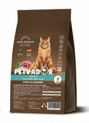 Гипоаллергенный рацион PETVADOR ADULT повысит жизненные силы питомца, принесет гармонию развития и здоровье пищеварительной системы. В основе данного рациона, богатые своим витаминным и минеральным составом телятина и аминокислотным составом легкоусвояемая курица. Данный корм будет способствовать здоровью кожи, слизистых оболочек, пищеварительной и нервной систем. Клюква оказывает самое благотворное действие на пищеварительную и иммунную систему кошек, поддерживает здоровье мочеполовой системы и почек. Клюква богата антиоксидантами, противораковыми агентами, витамином С и клетчаткой. Льняное масло содержит в себе линоленовую и линолевую кислоты, которые относятся к незаменимым жирным кислотам. Эти кислоты являются источником для Омега-3 и Омега-6 жирных кислот соответственно. Кроме того, в состав льняного масла входят витамины А, Е, В, К. 1-ый и основной ингредиент – ДЕГИДРИРОВАННОЕ МЯСО ТЕЛЁНКА Гипоаллергенные ингредиенты Произведено в России по испанским технологиям Сбалансированное содержание Omega-6 и Omega-3 жирных кислот. Не содержит: кукурузу, пшеницу, свеклу, яйца, сою, ГМО, красители, искусственные ароматизаторы, искусственные консерванты.