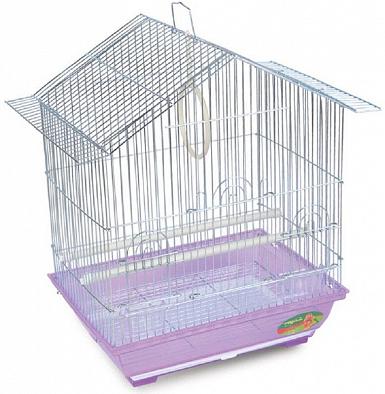 Клетка для птиц с фигурной крышей. Пластиковый выдвижной поддон для облегчения процесса уборки. Поддон под решеткой. Решетка - цинк. Цвет поддона: сиреневый, зеленый, голубой