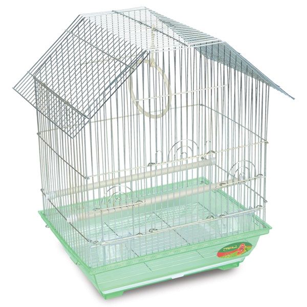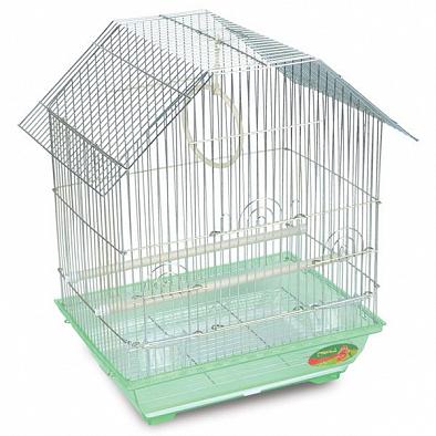 Клетка для птиц с фигурной крышей. В комплект клетки входит: 2 пластиковые кормушки, 2 пластиковые жердочки, качели. Пластиковый выдвижной поддон для облегчения процесса уборки. Поддон под решеткой. Решетка - эмаль.
