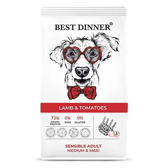 Высококачественный полнорационный корм для собак средних и крупных пород Best Dinner с ягненком и томатами создан специально для собак с особыми потребностями. Томаты - источник холина и каротиноидов. Способствуют профилактике болезней сердца и укрепляют иммунитет. Нежное мясо ягненка обладает отличной усвояемостью и подходит для собак склонных к аллергическим реакциям и проблемами с пищеварением.
