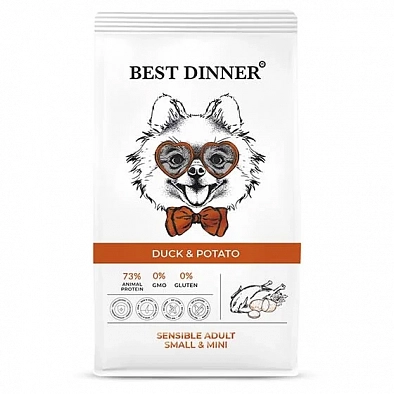 Высококачественный полнорационный корм для собак мелких пород Best Dinner с с уткой и картофелем создан специально для собак с особыми потребностями. Нежное мясо утки обладает отличной усвояемостью и подходит для собак склонных к аллергическим реакциям и проблемами с пищеварением. Юкка Шидигера способствует улучшению пищеварения. Экстракт бархатцев поможет в снятии воспалений с чувствительной пищеварительной системы.