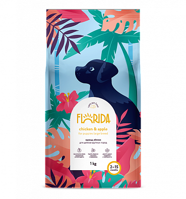 Florida Chicken and Apple - сухой корм супер-премиум класса с курицей и яблоком для щенков крупных пород. Сбалансированное полнорационное питание, способствующее правильному развитию щенка.