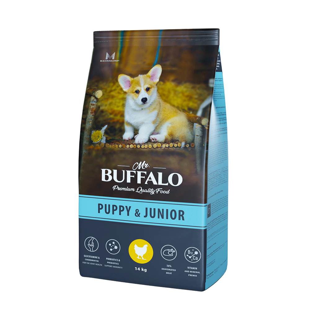 Полнорационный сухой корм Mr.Buffalo с курицей для щенков и юниоров средних и крупных пород. Сбалансированный рацион содержит необходимое количество белков и жиров, что обеспечивает равномерный рост щенка, тем самым снижая нагрузку на опорно-двигательный аппарат. Входящая в состав уникальная добавка MacroGard® способствует формированию и поддержке иммунной системы щенка. Рецепт приготовлен из качественных ингредиентов, не содержит глютена или любого другого вещества, которое может нанести вред здоровью вашего любимца.