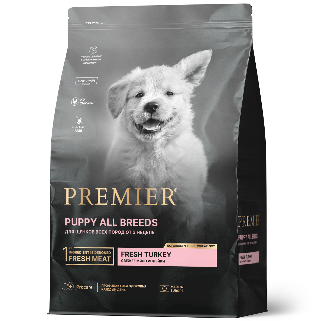 Полнорационный сухой корм супер-премиум класса на основе свежего мяса индейки для щенков всех пород с 3-недельного возраста, беременных и кормящих собак. Тщательно подобранные и прекрасно сбалансированные ингредиенты отвечают всем особым потребностям растущего питомца. Идеально подойдет питомцам склонным к аллергии, поможет укрепить иммунитет и улучшить состояние шерсти и кожи.