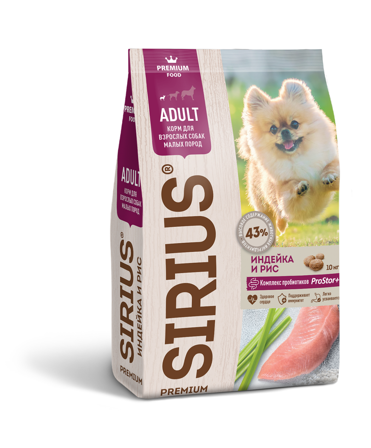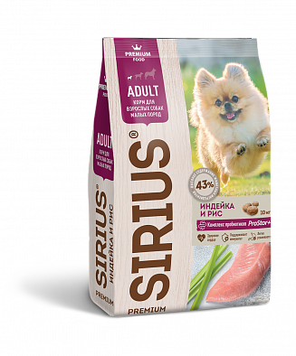 SIRIUS — сухой корм премиум класса для полноценного ежедневного рациона взрослых собак малых пород. Высокое содержание мясных ингредиентов обеспечивает оптимальный уровень белка и укрепляет мышцы. Баланс витаминов и комплекса пробиотиков 4-го поколения PROSTOR+ нормализует пищеварение и укрепляет иммунитет. Омега 3 и Омега 6 способствуют поддержанию здоровья сердца, мозга, нервной системы, здоровья кожи и красоты шерсти.