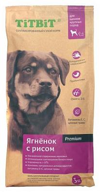 TiTBiT сбалансированный сухой корм премиум класса с ягненком и рисом для щенков крупных пород, специально разработан для удовлетворения потребностей растущего организма. Содержит все необходимые витамины, минералы и микроэлементы, необходимые для здорового развития. Обладает великолепными вкусовыми качествами. Особенностью корма для щенков крупных пород является высокое содержание протеина, необходимого строительного материал для организма, его роста и формирования мышечной системы.