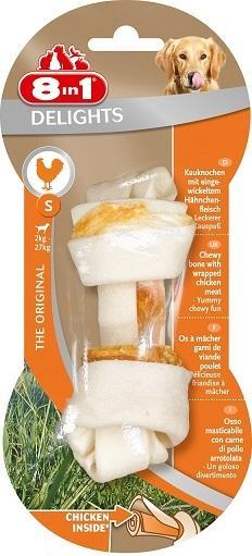 8 in1 DELIGHTS S косточка для мелких и средних пород собак. Аппетитное куриное мясо, завернутое в жесткую говяжью кожу высшего качества – уникальное сочетание жевательной косточки и средства поощрения. • 9 из 10 собак предпочитают лакомство Делайтс* • Уникальный и запатентованный продукт • Заботится о зубах • Уменьшает зубной налет и тем самым предотвращает образование зубного камня • Удовлетворяет природный жевательный инстинкт собаки • Долго жуется, съедается без остатка • Содержит всего 2 % жира • Не содержит искусственных красителей и усилителей вкуса * Исследование предпочтений 2010г.