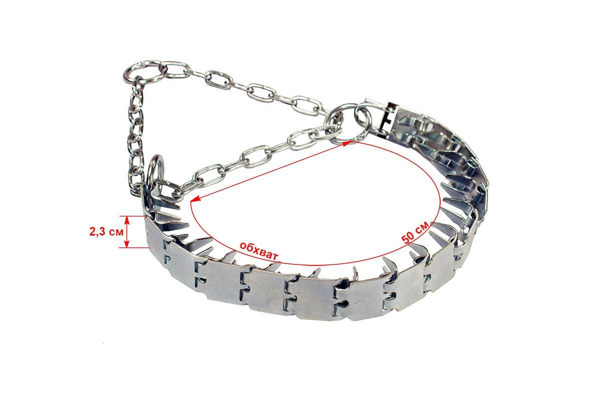 Ошейник из металлических пластин с загнутыми со стороны шеи собаки шипами высотой 1см. Пластины покрыты никелем.
